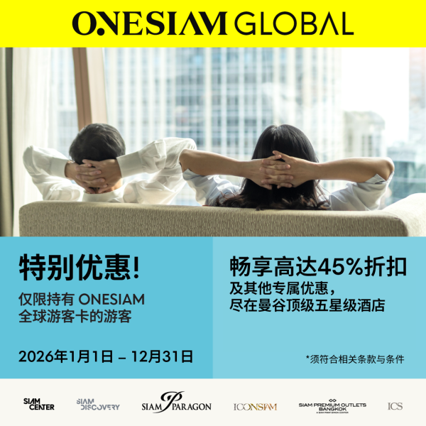 游客专属特权机会难得,千万不能错过!马上解锁物超所值且与众不同的购物体验,在ONESIAM暹罗商圈尽享购物乐趣!查看更多信息 现在申请! ONESIAM: 迈向非凡我们诚挚邀请您通过ONESIAM体验开始一段探索之旅,这是曼谷市中心六个世界级体验目的地的“非凡体验集合”,即暹罗百丽宫Siam Paragon、暹罗中心Siam Center、暹罗探索Siam Discovery、暹罗天地ICONSIAM 、ICS、曼谷暹罗名品折扣购物中心和ONESIAM SuperApp。欢迎您前来享受沉浸在时尚、美食和娱乐的文化马赛克中,每次访问都能收获无与伦比的喜悦。查看更多关于ONESIAM暹罗商圈 我们的购物目的地参观每个购物中心的网站SIAM PARAGONSIAM CENTERSIAM DISCOVERY ICONSIAM ICS Siam Premium Outlets Bangkok 最新动态您绝不能错过的精彩活动趣味工作坊 & 免费爆米花!越买越多,礼遇升级 支付宝中国用户专属吃 · 喝 · 放松 曼谷最潮酒吧与美食查看全部 促销和特权享受最佳的优惠和特权 仅限持有 ONESIAM 全球游客卡的游客曼谷尊享酒店礼遇微信支付用户尊享查看全部 出行计划的灵感之源让计划变成进行时!从极具特色的各式商店到美食餐厅推荐名单,一应俱全,带来超凡体验歡迎來到ONESIAM暹羅商圈!世界艺术荟萃泰国顶尖艺术玩具终点站查看全部领取您的专属特权ONESIAM暹罗商圈游客优惠卡今日!查看更多信息 现在申请! 专属特权免费WIFI高达6% 市区退税于参加活动的品牌购物乐享高达80%折扣于参加活动的品牌购物乐享国际游客促销优惠于百丽宫百货,Gourmet Market超市,暹罗探索购物乐享高达5%折扣Up to 5% Discount in Siam Takashimaya游客尊享特权免费WIFI于参加活动的品牌购物乐享国际游客促销优惠
