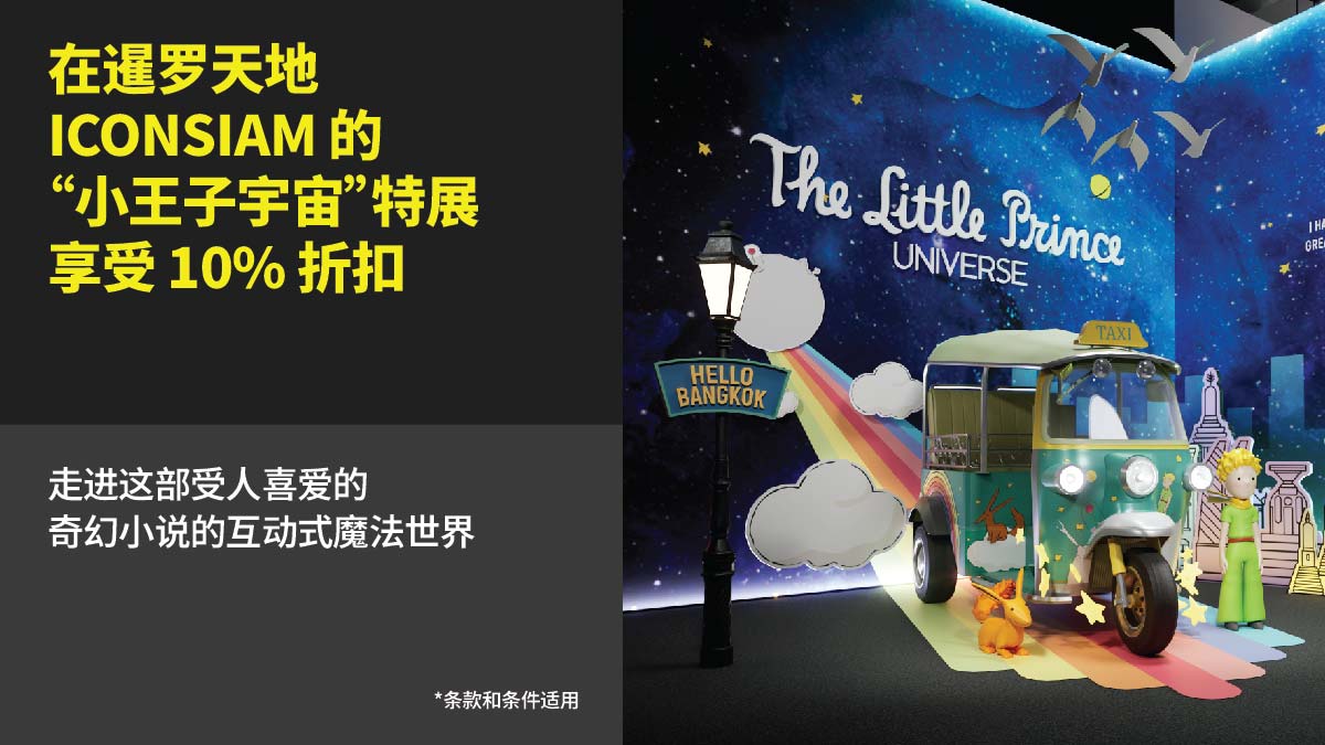 - 在 暹罗天地ICONSIAM 的“小王子宇宙——沉浸式旅程”特展享受 10% 折扣,走进这部受人喜爱的奇幻小说的互动式魔法世界。