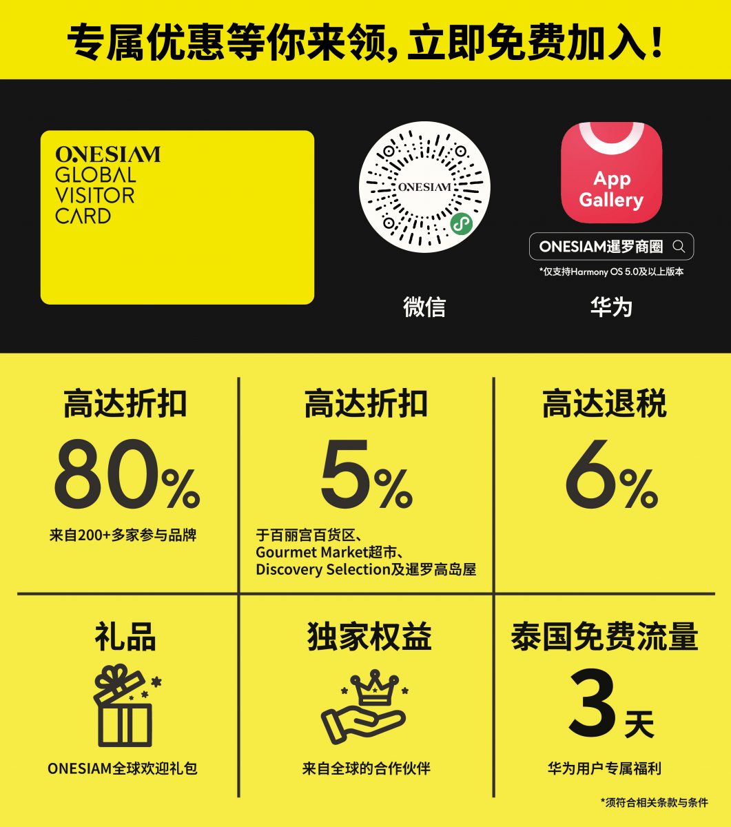 华为天际通用户尊享免费200泰铢暹罗礼品卡——只需申请ONESIAM全球游客卡并出示华为天际通电子优惠券即可领取。