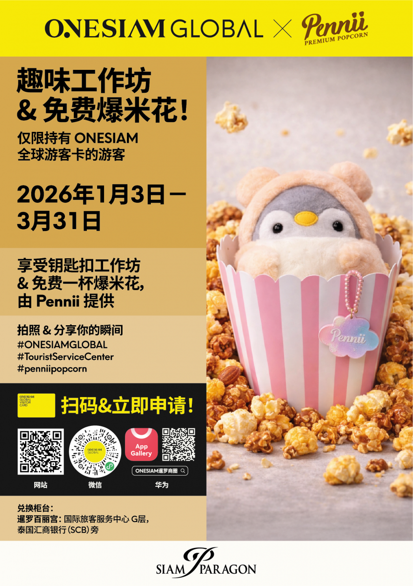 别忘了拍照并在社交媒体上分享您的美好瞬间,使用标签:#ONESIAMGLOBAL #TouristServiceCenter #penniipopcorn