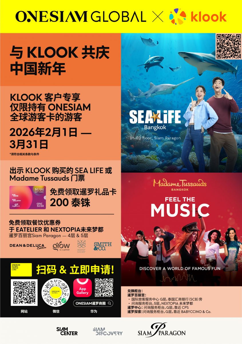 - 仅适用于通过 Klook 购买的曼谷海洋世界和曼谷杜莎夫人蜡像馆成人票(18 岁以上)在2026年2月1日-2026年3月31日 期间。