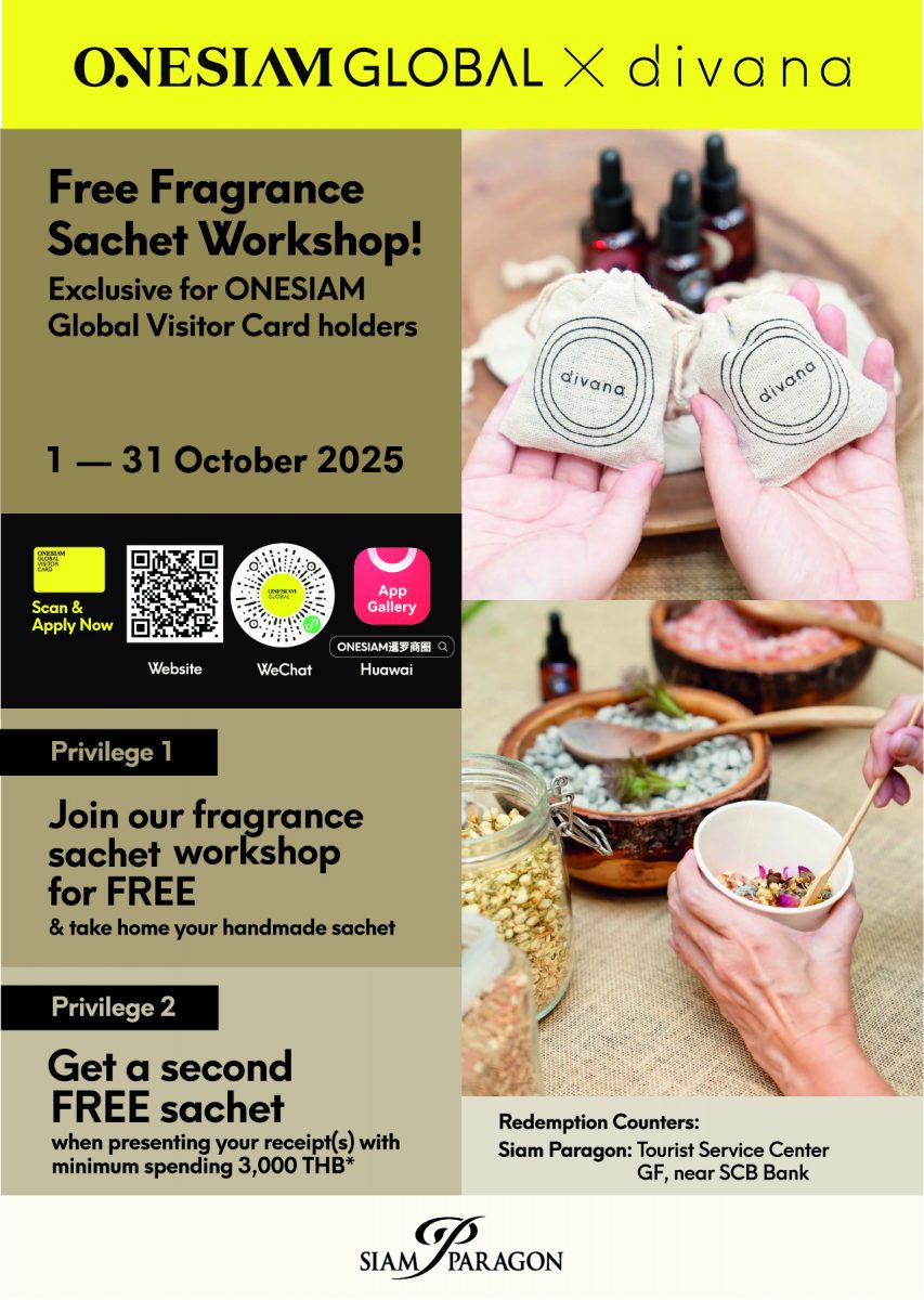 | Privilege #1 Receive free 10-minute neck & shoulder massage by certified therapists from Wat Pho and a free gift every Friday, Saturday and Sunday Privilege #2 Enjoy 10-minute massage upgrade with minimum spending of 3,000 THB at any ONESIAM shopping destination: Siam Center, Siam Discovery, Siam Paragon and ICONSIAM | Privilege #1 Join the fragrance sachet workshop for free and take home your handmade sachet by Divana Privilege #2 Get a second free sachet with minimum spending of 3,000 THB* at Siam Paragon |