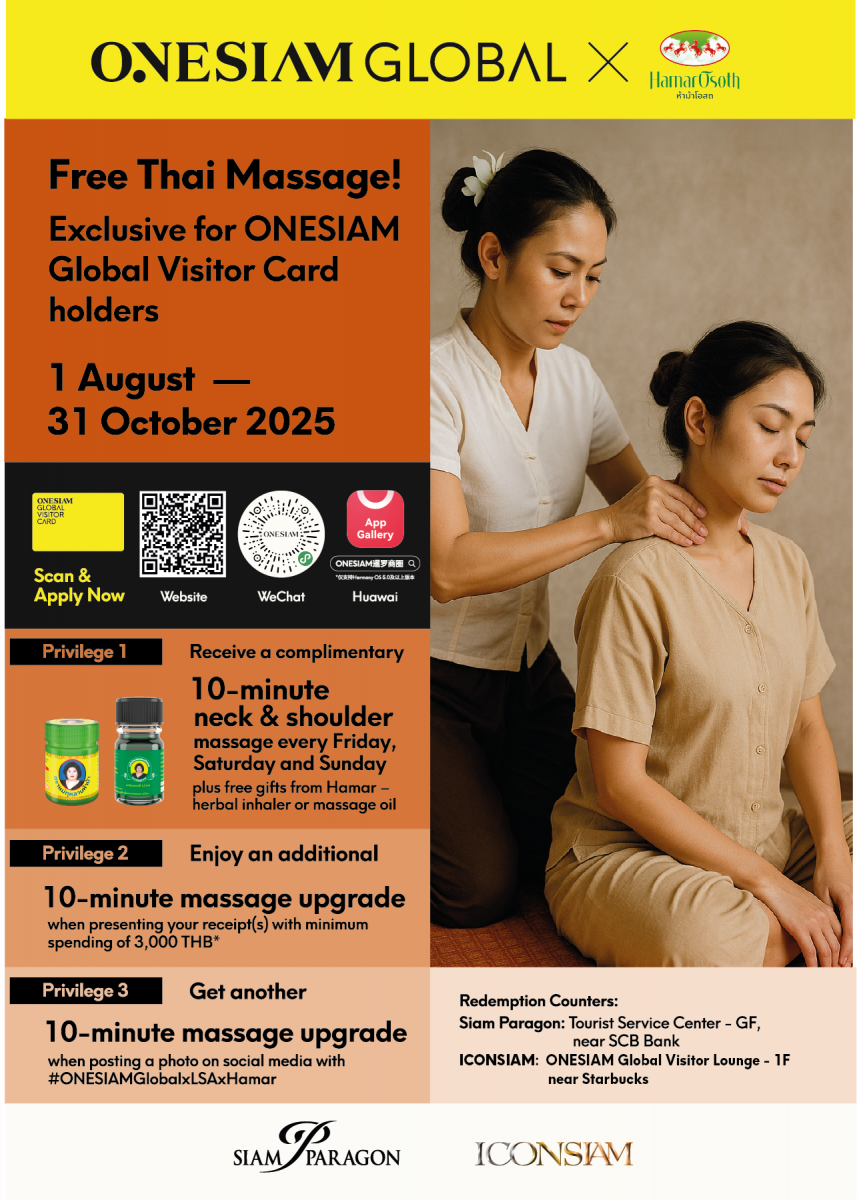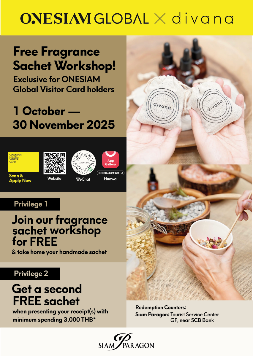 Privilege #1 Receive free 10-minute neck & shoulder massage by certified therapists from Wat Pho and a free gift every Friday, Saturday and Sunday Privilege #2 Enjoy 10-minute massage upgrade with minimum spending of 3,000 THB at any ONESIAM shopping destination: Siam Center, Siam Discovery, Siam Paragon and ICONSIAM | Privilege #1 Join the fragrance sachet workshop for free and take home your handmade sachet by Divana Privilege #2 Get a second free sachet with minimum spending of 3,000 THB* at Siam Paragon |